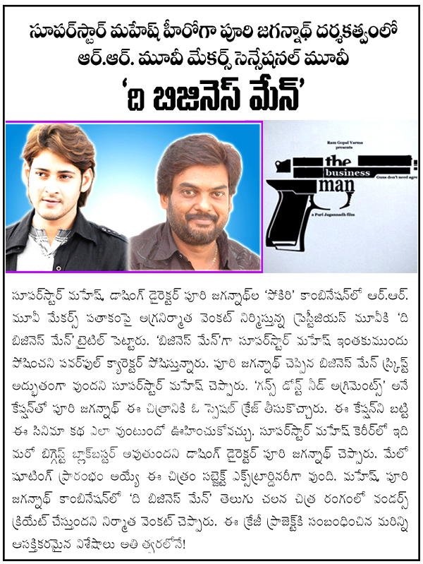 The idea is to make “The Business Man” into a trilingual that is in three languages Hindi, Tamil and Telugu. Unlike in the done to death rustic style of conventional gangster flicks the shooting style of “THE BUSINESS MAN” will fall somewhere inbetween the slickness of “COMPANY” and the entertainment quotient of “WANTED” The Concept By the year 2010, the underworld as we knew it has become non-existent primarily due to the Dawood Ibrahim gang going legitimate in Pakistan, Chota Shakeel becoming completely inactive, Chota Rajan co-operating with the various government agencies, Arun Gawli becoming a politician and Abu Salem being put in jail. The success of the Mumbai Police in wiping out the underworld has been so total and so complete that the Police Department even disbanded their encounter squad teams as they were of no further use. These developments were carefully being studied and observed by an entrepreneur from the South. He was like so many other innumerable entrepreneurs from all over the country who land up in Mumbai with dreams of reinventing business practices which have become outdated. But this particular entrepreneur’s business was that of CRIME. He minutely studied and educated himself on both the shortcomings and achievements of every gangster that ever ruled Mumbai, ranging from Haji Mastan to Vardha Bhai to Karim Lala to Dawood Ibrahim to Chota Rajan and then landed up in Mumbai to become its biggest gangster ever. He believed that there is no such thing as right and wrong and there is no such thing as good and bad. He also believed that everyone in this world go through their lives in one way or the other only by making deals. Whether it’s between husbands and wives or between parents and children or between Godmen and devotees or between politicians and voters, life is nothing but about making deals. So as long as everyone is into some kind of business or the other, he decided that even crime should be treated and dealt with like any other BUSINESS. Welcome to the new-age gangster. The Business Man — Guns Don’t Need Arguments keka undi concept...kaani ekkado chadinattu/vinattu undi...moreover negativ shade undettu undi...mahesh etta oppukunnadu  |