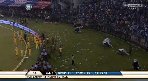 9.41pm Uh oh. More bottles are being flung into the ground, and play has come to a halt for the moment. |
